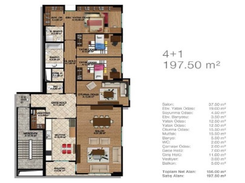 مساحات الشقق : تتراوح المساحة من 97 متر مربع ولغاية 199 متر مربع.
