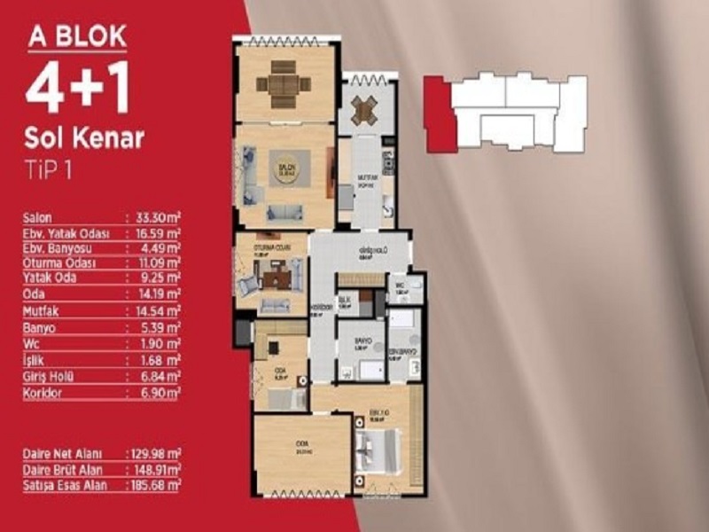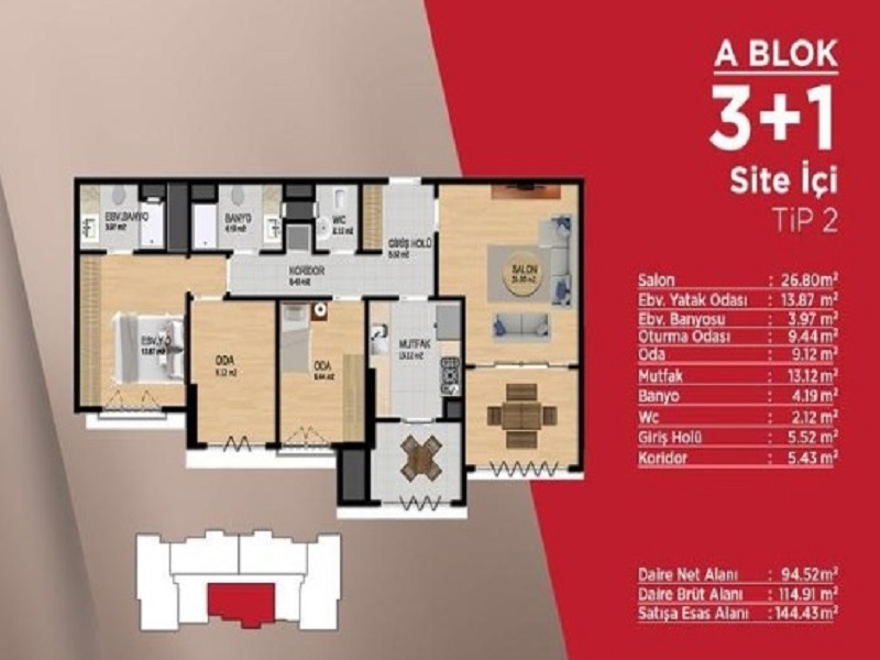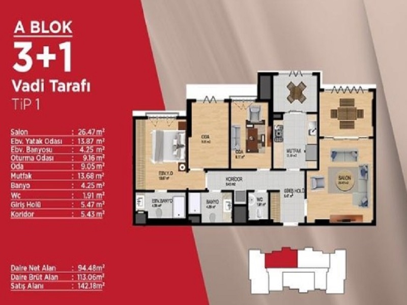 مساحات الشقق : تتراوح المساحة من 141.5 متر مربع ولغاية 150.23 متر مربع.